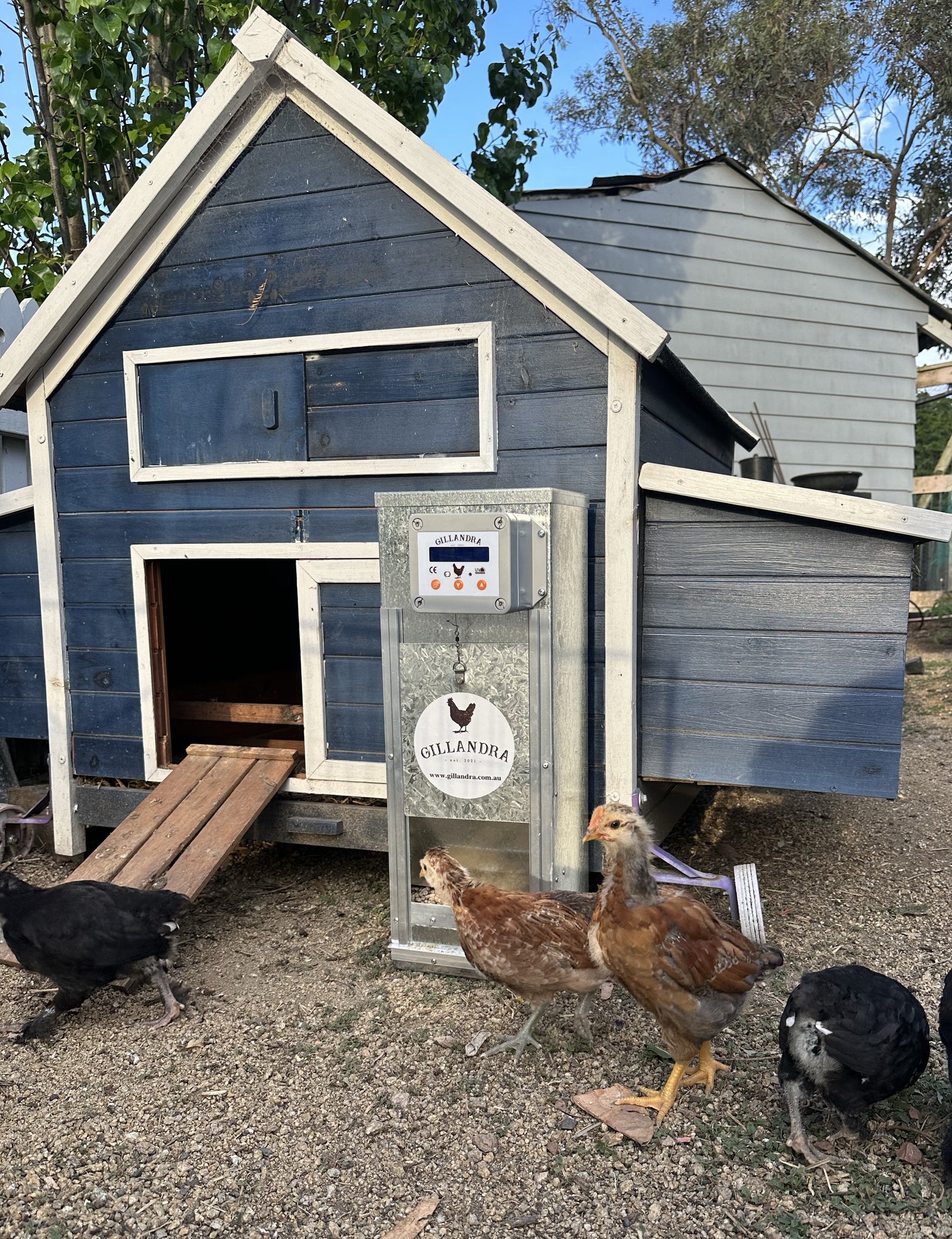 The pellets automatically feed down the chute as the chickens eat the pellets. This ensures the chickens have a constant supply of feed. The Auto10 can be programmed to open at sunrise and close at sunset. There is also the option to set the door to open and close at set times up to 3 times per day.